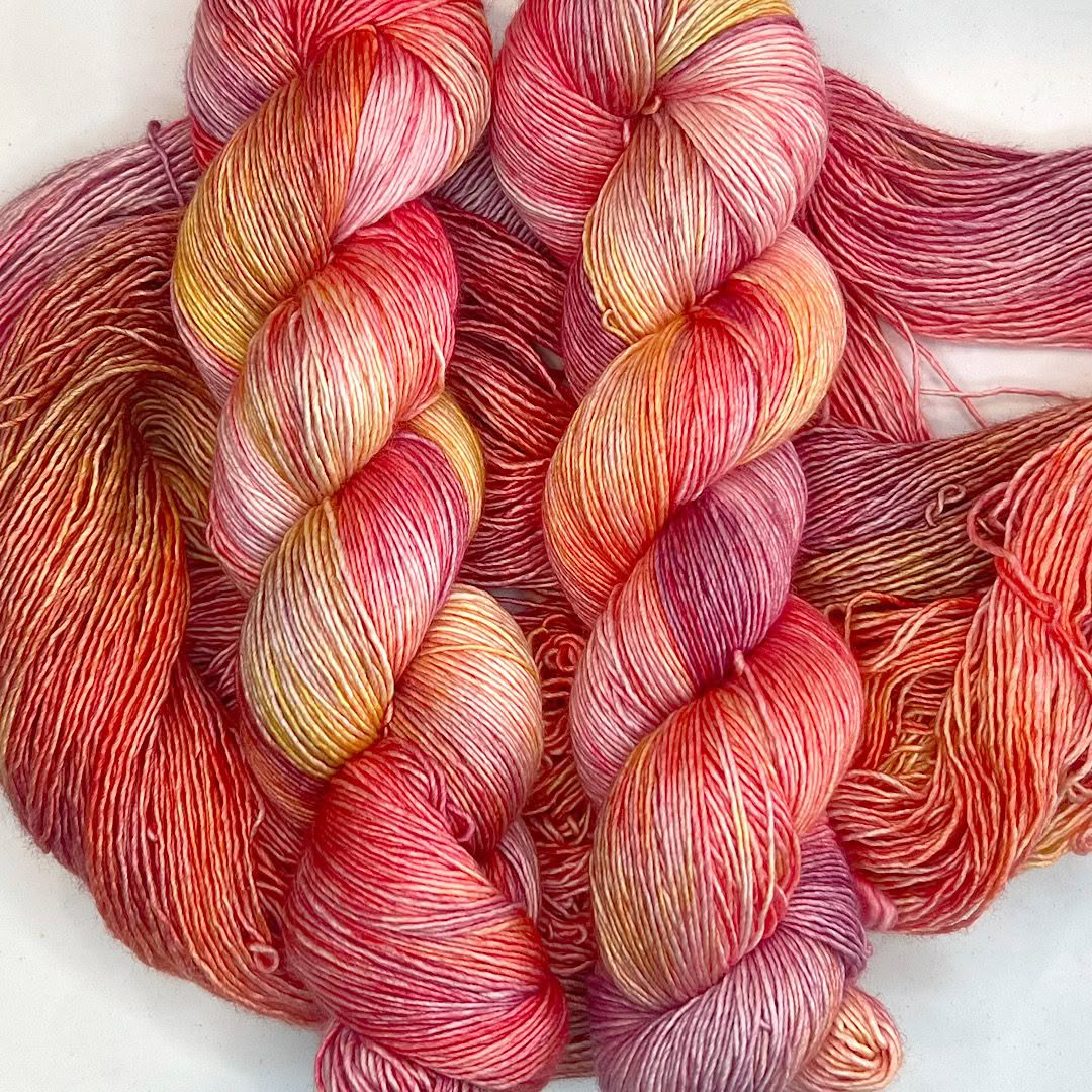 This super soft shiny yarn is a blend of reds, purple and oranges and gold.