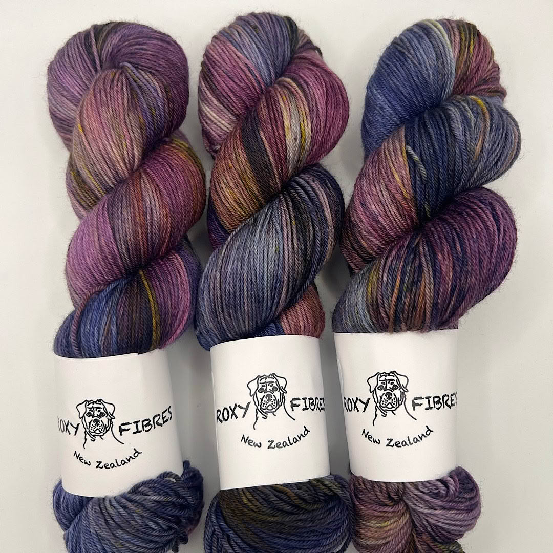 I love fantasy novels, and dragons, so this yarn named itself! For those of you who are Fourth Wing fans, think Tairn’s (black) hues, Sgaeyl’s (Blue) with dashes of Andarna (Golden). The main character is Violet. I hope you like this colourway.